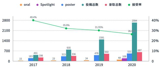 本次会议共接收论文2594篇,在线提交系统收到来稿687份稿件,并计算得出其论文接收率约为26.48%。从图表中可以看出:投稿总数持续增长,在过去几年中呈现出逐年递增的趋势;其中,在2020年呈现了显著的增长态势;与此同时被录取数量呈现出上升的趋势但增幅相对较小;由此可知 今年的论文接收率较往年有所下降