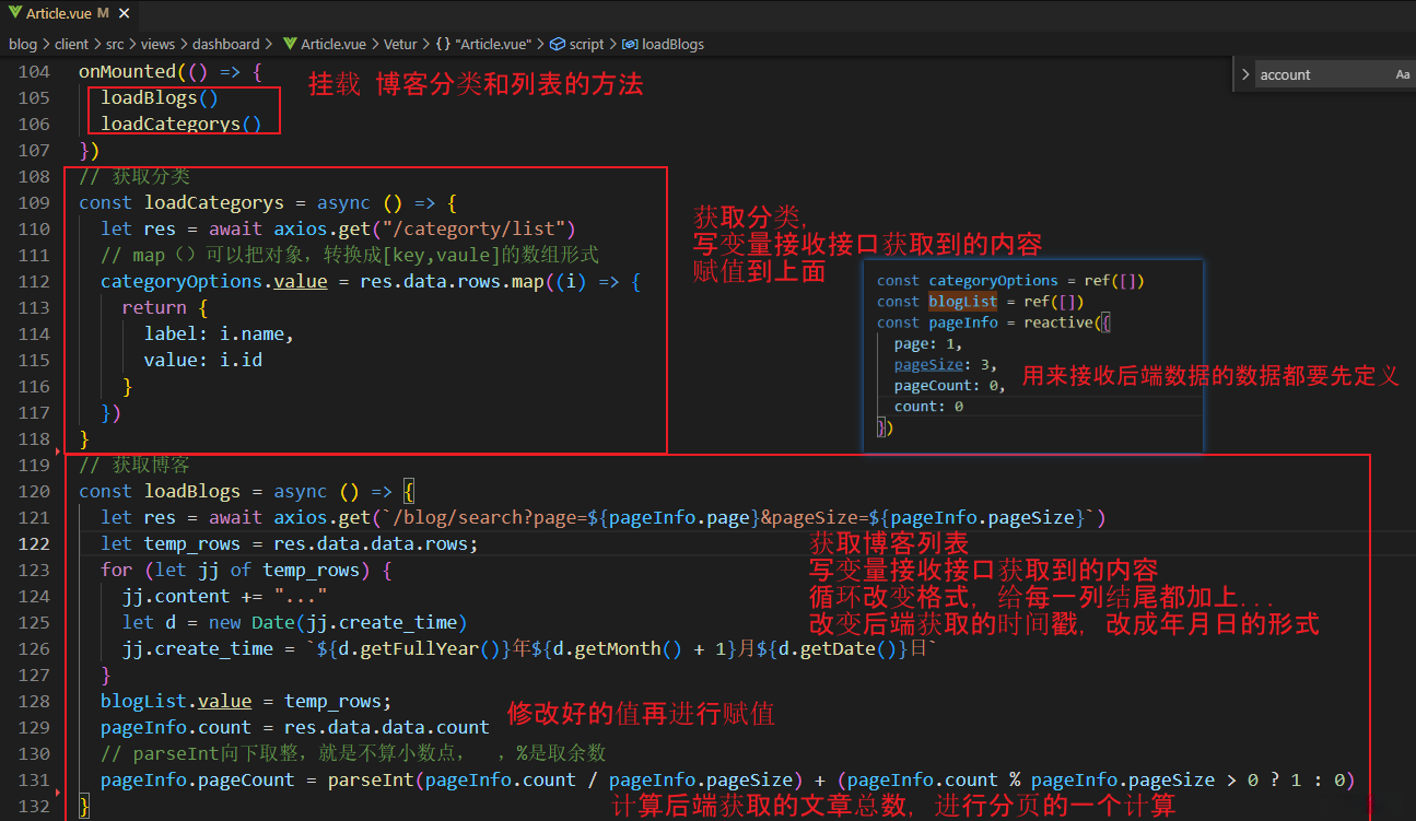 1.获取博客列表、博客分类 的方法,进行挂载,用来接收后端的数据都要先定义好空间。