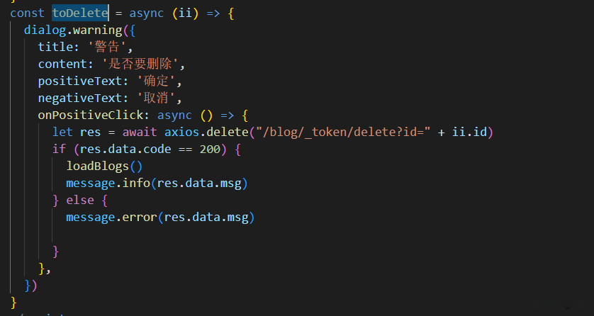 4.删除博客 ,调用接口,传id给后端, 就可以删除数据了。这里是组件的弹出确认的模态框。