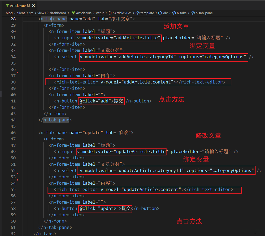 二、添加、修改文章 (1)绑定变量 (2)点击方法