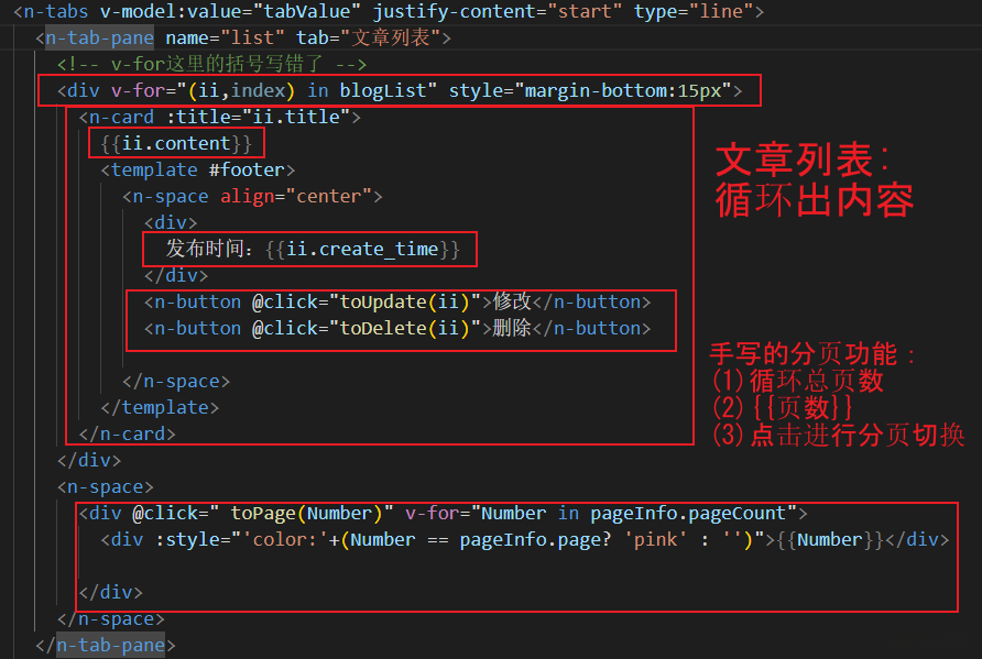 一、文章列表 : 循环出内容,手写分页功能步骤: (1) 循环出总页数 {{页数}} (2) 点击进行分页切换