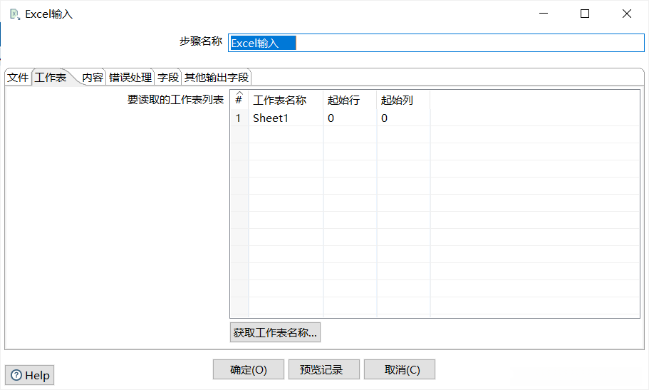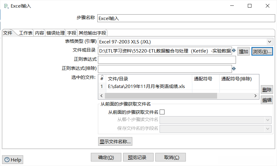 双击“Excel输入”控件,进入“Excel输入”配置界面,单击“浏览”按钮,选择2019年11月月考英语成绩.xls;单击“增加”按钮,具体效果如图32所示;单击“工作表”选项卡,获取工作表,如图33所示;单击“字段”选项卡,添加字段,如图34所示: