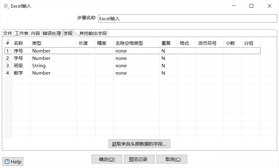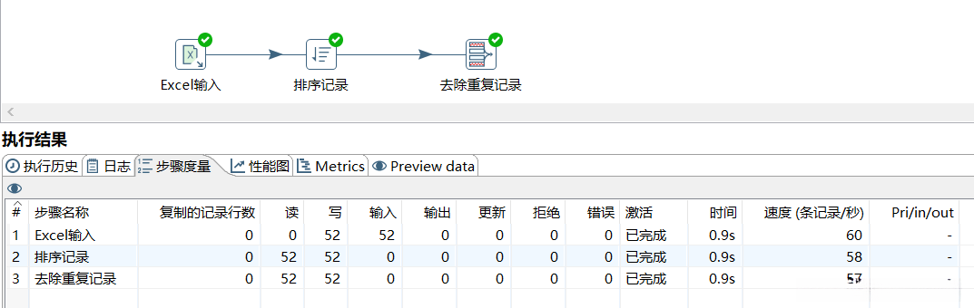 单击转换工作区顶部的 按钮,运行创建的转换,执行结果中以去除序号2,具体如图30所示: