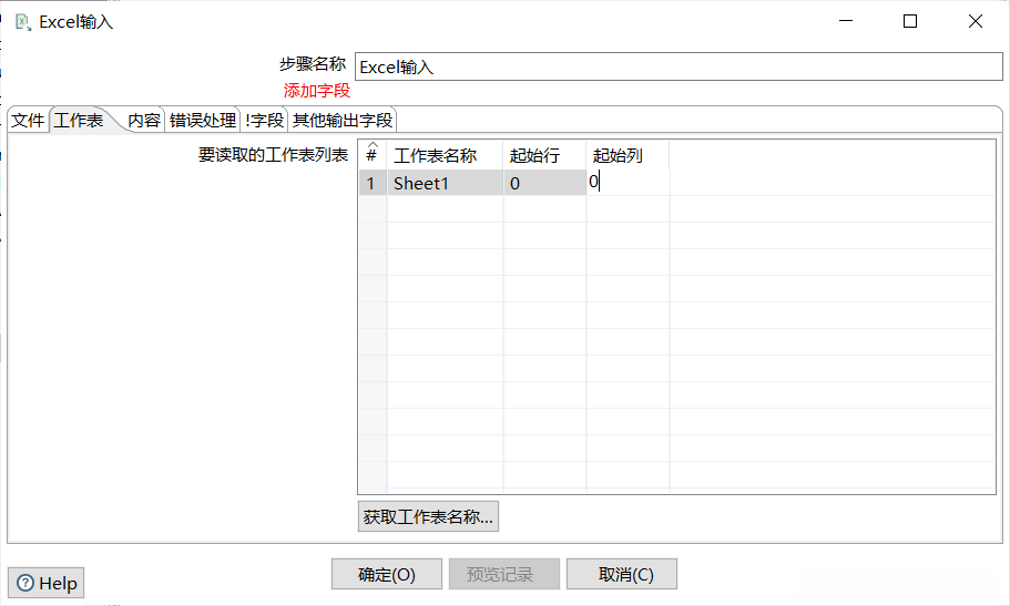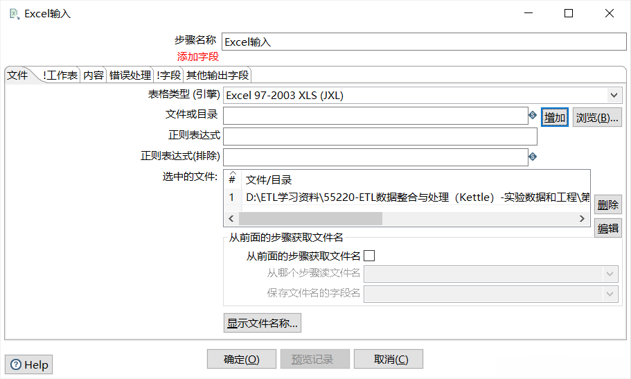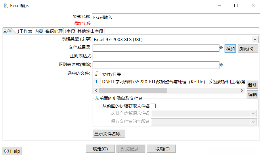 双击“Excel输入”控件,进入“Excel输入”配置界面,单击“浏览”按钮,选择物理成绩.xls;单击“增加”按钮,具体效果如图2所示;单击“工作表”选项卡,获取工作表,如图3所示;单击“字段”选项卡,添加字段,如图4所示: