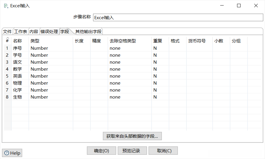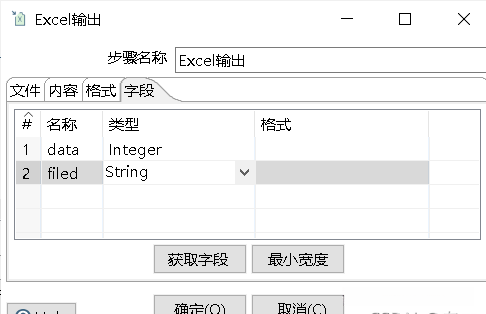双击“Excel输出”控件,进入“Excel输出”配置界面,单击“字段”选项卡,添加字段,如图13所示: