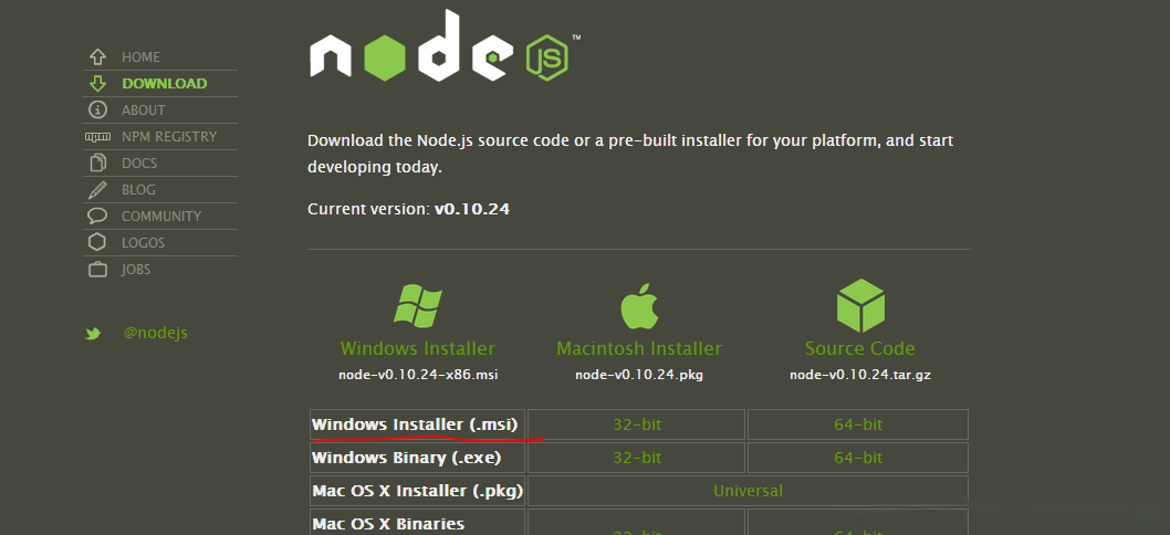 下载nodejs安装包(http://nodejs.org/download/)安装