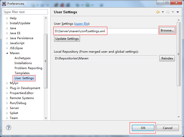 2. 单击 "Browse" 按钮后,请您导航到你的 Maven 设置文件路径下的 "setting.xml" 文件,并选择并确认该设置以完成Eclipse Maven插件的配置。