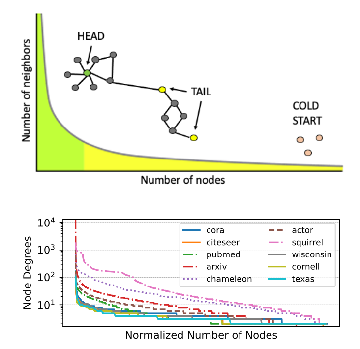 图 1:顶部:节点可能表现出长尾分布特征,其中大部分节点(以黄色表示)几乎未连接。底部:在真实世界的数据集中,长尾分布的特性限制了现有图神经网络在尾部/冷启动节点上的适用性。
