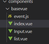 项目架构中, event.js生成Vue实例对象, Input.vue和list.vue分别作为子组件存在;在index.vue中引入了两个相关子组件, 实现了Input与list之间的数据交互。