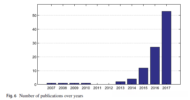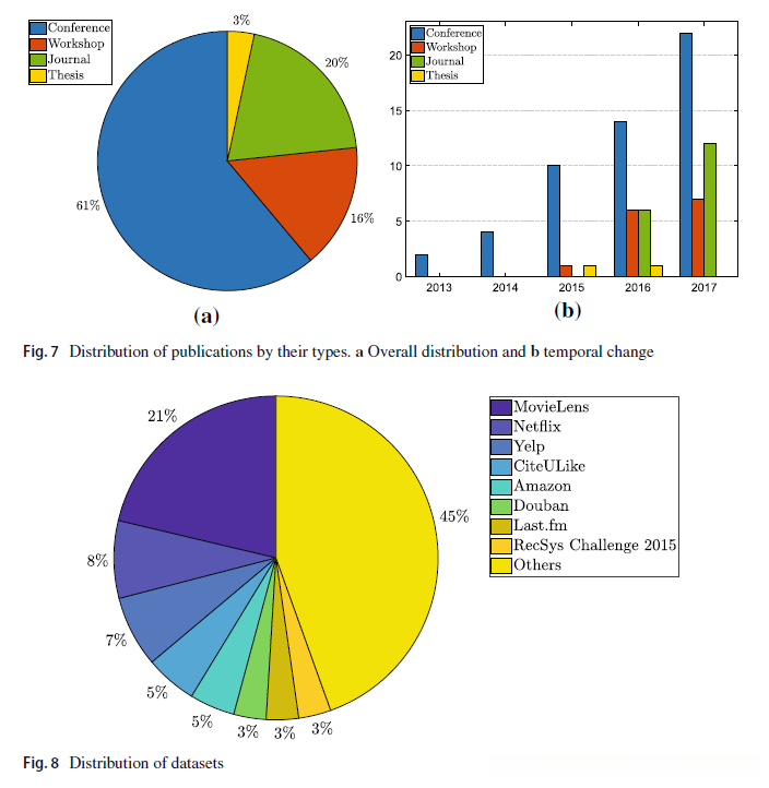 首先,我们在图6中展示了这些年来的出版物数量。自从萨拉赫胡迪诺夫等人进行了第一项非凡的工作以来。( 2007 ),将深度学习技术应用于推荐系统的趋势越来越明显。从那以后,该领域提出的研究数量一直在上升。作为该领域出现的一个重要标志,请注意,2016年发表了27篇研究论文,而本次调查涵盖了2017年的50多项研究。