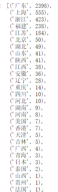 locations = [location for location in df_taobao["location"].value_counts().items()] #提取省份和数量使用items组成元组