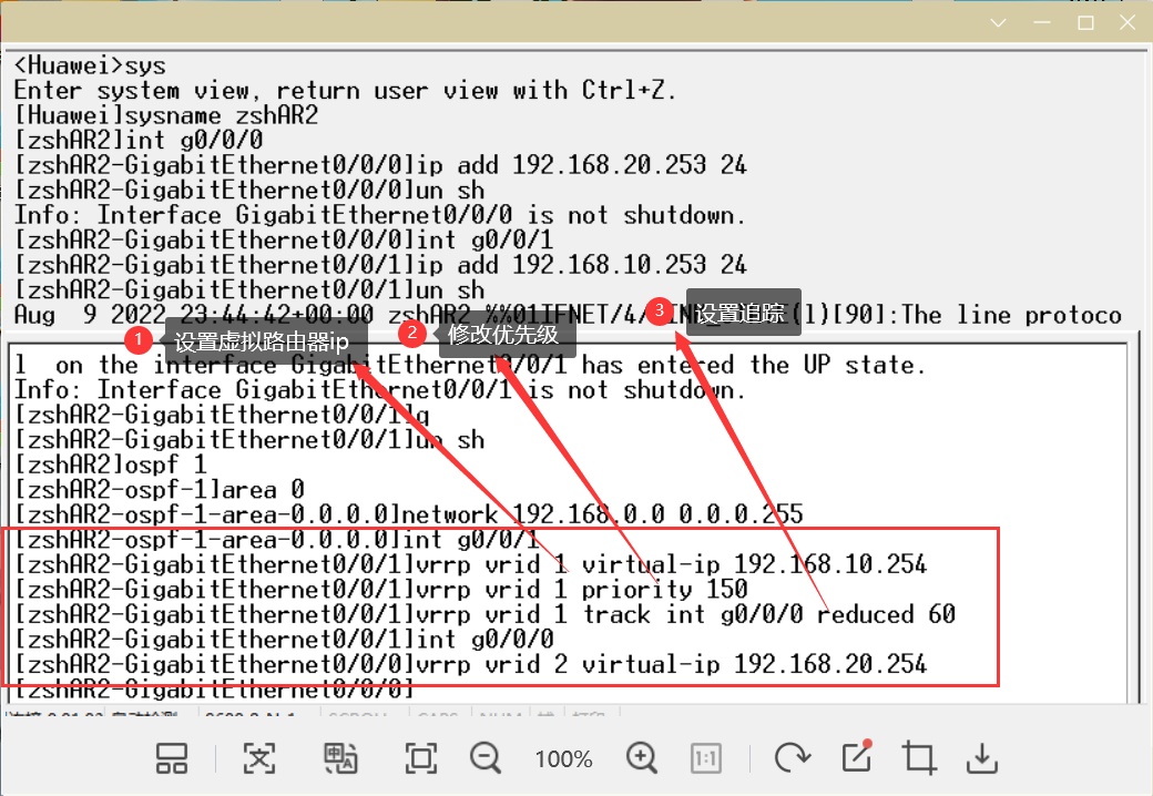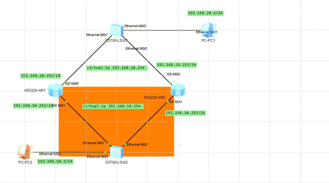- [R2-GigabitEthernet0/0/0]vrrp vrid 2 virtual-ip 192.168.20.254-----------------------设置虚拟机路由器IP