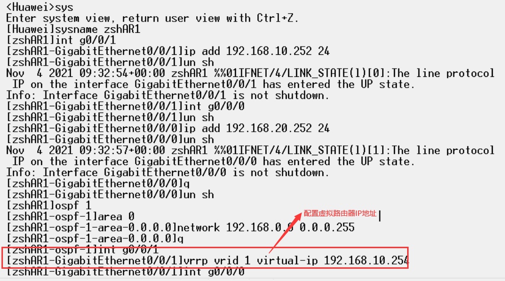 - [R1-GigabitEthernet0/0/1]vrrp vrid 1 virtual-ip 192.168.10.254-------------设置虚拟路由器IP