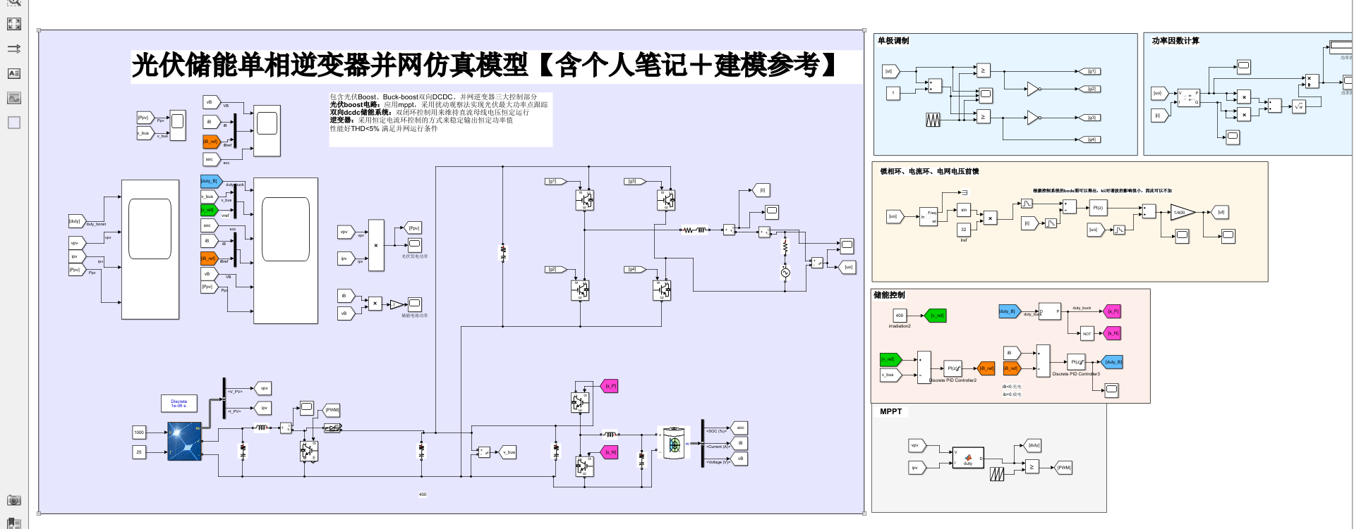 综上所述,该系统的主要组成部分包括Boost、Buck-boost双向DCDC变换器和并网逆变器,这些关键控制模块的优化设计和有效控制均有助于提升系统的高效率性和高可靠性。同时,该系统具有高效率性、高可靠性和高灵活性,能够实现光伏发电系统的高效率利用和储能系统的精准管理。针对光伏储能单相逆变器的并网仿真建模问题,该研究不仅为光伏储能系统的设计和运行提供了理论参考,也为储能系统的技术优化和性能提升提供了技术支持。此外,该研究还对提高光伏发电系统的并网稳定性和可靠性具有重要意义,有助于提升并网系统的安全性,从而推动光伏发电与储能技术的深度融合,为清洁能源的应用和发展奠定基础。