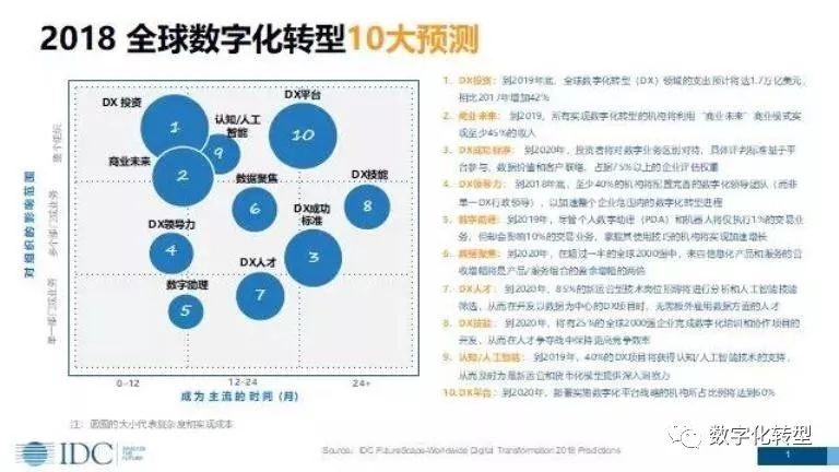 2018年数字化转型的十大预测,一是DX投资,到2019年底,全球数字化转型(DX)领域的支出预计将达1.7万亿美元,相比2017年增加42%。二是商业未来,到2019年,所有实现数字化转型的机构将利用“商业未来”商业模式实现至少45%的收入。三是DX成功标准,到2020年,投资者将对数字业务区别对待,具体评判标准基于平台参与、数据价值和客户联络,占据75%以上的企业评估权重。四是DX领导力,到2018年底,至少40%的机构将配置完善的数字化领导团队(而非单一DX行政领导),以加速整个企业范围内的数字化转型进程。五是数字助理,到2019年,尽管个人数字助理(PDA)和机器人将仅执行1%的交易业务,但却会影响10%的交易业务,掌握其使用技巧的机构将实现加速增长。六是数据聚焦,到2020年,在超过一半的全球2000强中,来自信息化产品和服务的营收增幅将是产品/服务组合的盈余增幅的两倍。七是DX人才,到2020年,85%的新运营型技术岗位招聘将进行分析和人工智能技能筛选,从而在开发以数据为中心的DX项目时,无需额外雇用数据方面的人才。八是DX技能,到2020年,将有25%的全球2000强企业完成数字化培训和协作项目的开发,从而在人才争夺战中保持更高竞争效率。九是认知/人工智能,到2019年,40%的DX项目将获得认知/人工智能技术的支持,从而及时为最新运营和货币化模型提供深入洞察力。十是DX平台,到2020年,部署实施数字化平台战略的机构所占比例将达到60%。