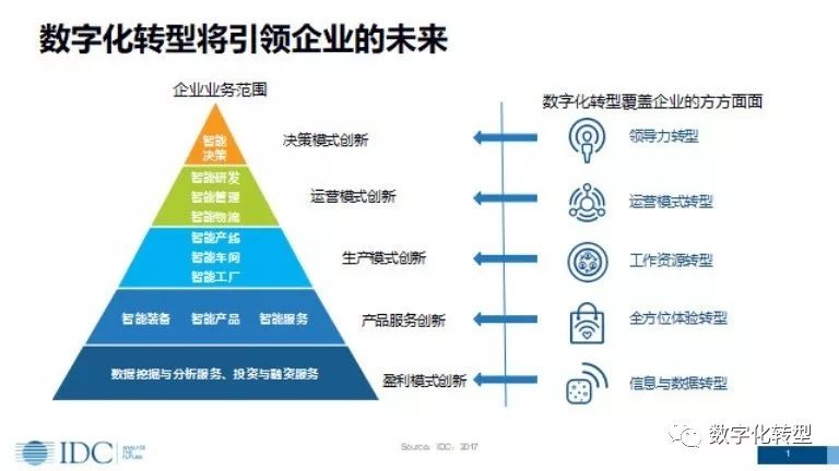 数字化转型为什么会引领企业的未来?以制造业企业为例,其业务范围呈现金字塔结构,最顶层是智能决策,强调实现决策模式创新;第二层是智能研发、智能管理、智能物流,强调实现运营模式创新;第三层是智能产线、智能车间、智能工厂,强调实现生产模式创新;第四层是智能装备、智能产品、智能服务,强调实现产品服务创新;第五层是数据挖掘与分析服务、投资与融资服务,强调盈利模式创新。这五大创新分别对应数字化转型的五大方面,一是领导力转型。数字化转型一定是业务转型,而业务转型则需要“一把手”的参与和决策。二是运营模式转型。三是工作资源转型,需要整合外部资源。四是全方位体验转型。需要满足用户的个性化需求,提升用户体验。五是信息与数据转型。信息与数据在未来将直接产生收入。
