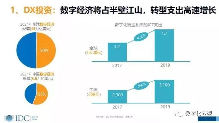 关于数字化转型的投资,未来数字经济将占半壁江山,转型支出高速增长。2021年,全球数字经济规模将达45万亿美元,占全球经济的50%,而中国数字规模将达到8.5万亿美元,占据全球经济的55%。目前,根据官方公布的数字显示,中国数字经济至少占30%,这一数字经济占比主要由两大部分组成。一是IT、通信、互联网等公司产生的增加值形成数字经济的一部分,这一占比不超过10%。二是传统行业、企业将信息技术与业务和产品相结合产生的增加值。比如,传统的家电企业如果将物联网、云计算等技术运用到产品中,这一产品就是数字化产品,所产生的销售收入和增加值就属于数字经济的范围。因此,传统行业、企业所产生的数字经济将占30%至40%。未来的产品和服务一定会与数字化和信息技术息息相关,IT也将从一个支持和工具的角色,转变成一个引领的角色。