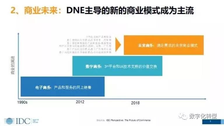 关于商业未来,DNE主导的新的商业模式成为主流。1990年至2012年这一阶段的商业模式主要是电子商务,即产品和服务的网上销售。2012年至2018年这一阶段的商业模式是数字商务,即3rd平台和IA技术支持的价值交换,云计算、大数据、移动社交等新技术支持整个企业商务的数字化。第三阶段是未来商务,即满足需求的未来商业模式,包括个性化定制产品和服务;基于使用的共享模式,如共享单车、汽车等;基于信息和数据的产品和服务,如数据变现;用户社区参与的商业模式,如团购、众筹、广告等;基于产出的定价模式,如基于广告效果分成;基于风险回报的共享商业模式,如合同能源管理等。