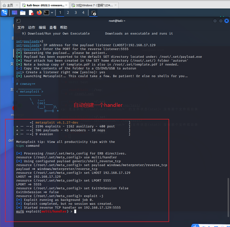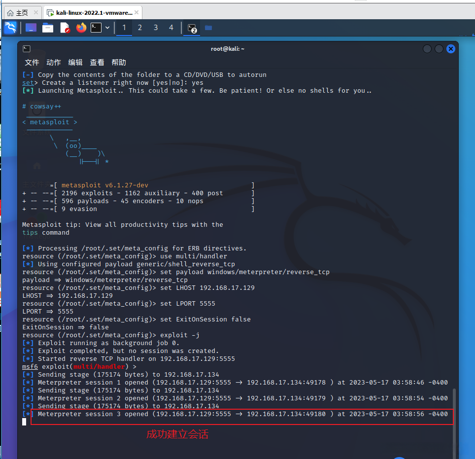 当计算机运行时会启动Autoruninf程序后, 该程序会启动并加载payload.exe. 然后随后进入KaliLinux2虚拟机环境中, 是否会开启对话?