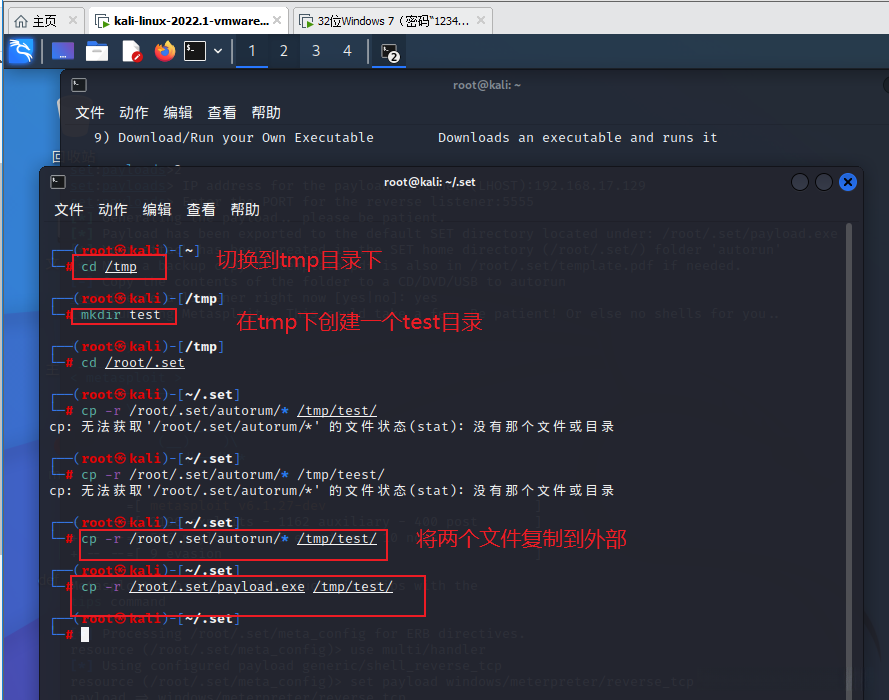 将/root/.set/autorun/目录中的两个文件移动到外部,在tmp 目录中新建一个test文件夹。