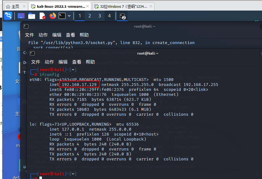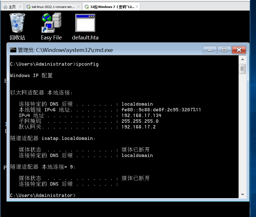 靶机 32 位 windows7 的IP: 192.168.17.134