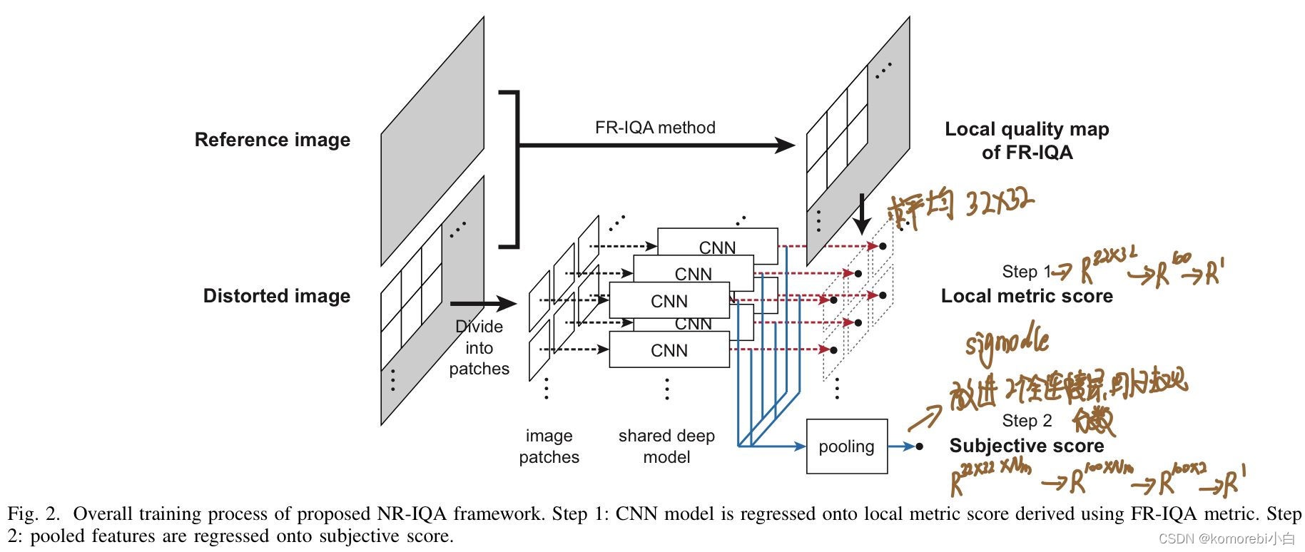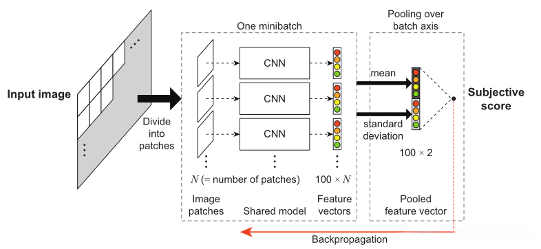 在第一步中,模型针对每个补丁对模型进行训练,将分割后的图像块回归到目标局部度量分数上,该分数源自传统的FR-IQA度量。在第二步中,对于训练,池化策略被合并,同时以最小化训练损失优化所有模型参数。FR-IQA指标用于生成步骤1中使用的局部指标得分。