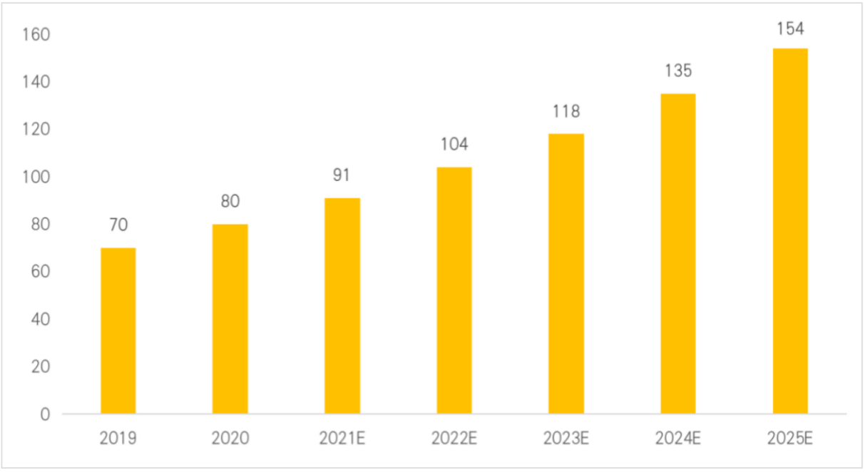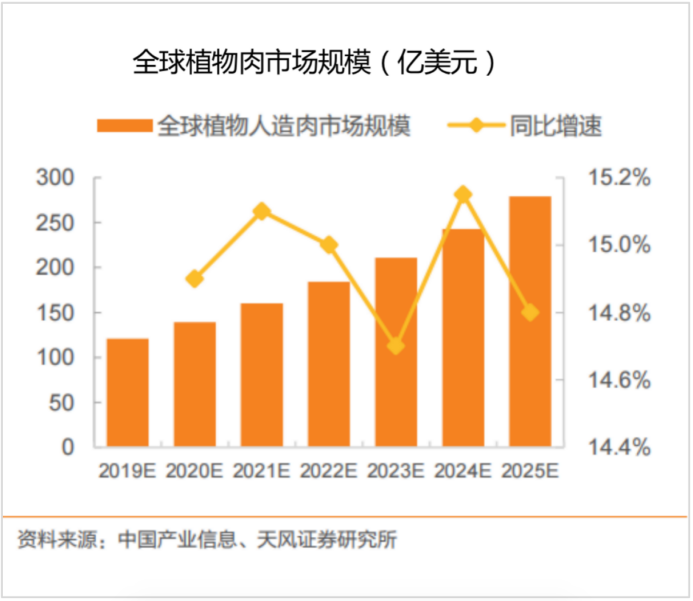 统计数据显示, 2019 年全球人造肉市场的规模约为百二十一亿美元; 预计到 2025 年时将增长至二百七十九亿美元; 复合年增长率(CAGR)将增长约百分之十五