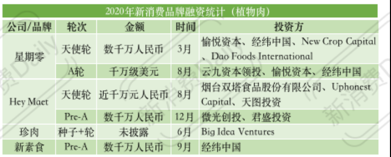 **中国融资企业:**星期零、Hey Maet、珍肉、新素食