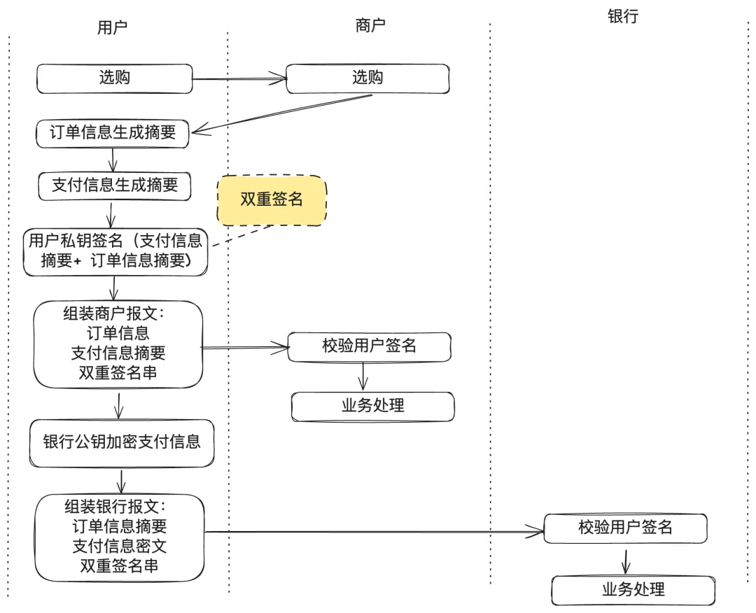 为了保证交易信息的完整性与真实性,并避免交易信息遭受篡改或受到抵赖。 typical transaction typically involves users, merchants, payment institutions, and banks in four parties, ensuring that all information exchanged remains unaltered and unalibiated.