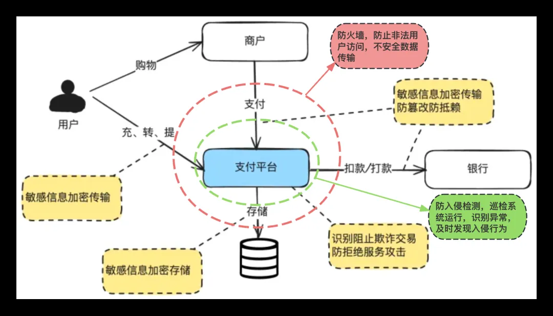 此图采用简约风格呈现支付安全的全貌,并涵盖支付安全的关键要素。