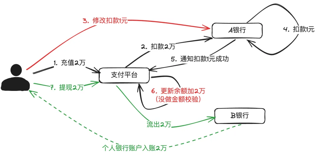 曾遇到过一个真实的案例:某黑客首先入侵并掌握了目标银行系统的管理权限,在掌握了控制权后,在其官方提供的安全通道上向该支付平台账户注入了两万美元资金。随后系统管理员发现异常情况后将原本应扣除的费用降为一美元,并将这一操作提交至相关部门进行处理。然而令人意外的是相关机构仅验证交易状态而不检查金额大小,在完成扣除操作后并未及时发现异常情况。待工作人员察觉时已为时已晚:此时事件已经导致相关机构蒙受了巨大的经济损失