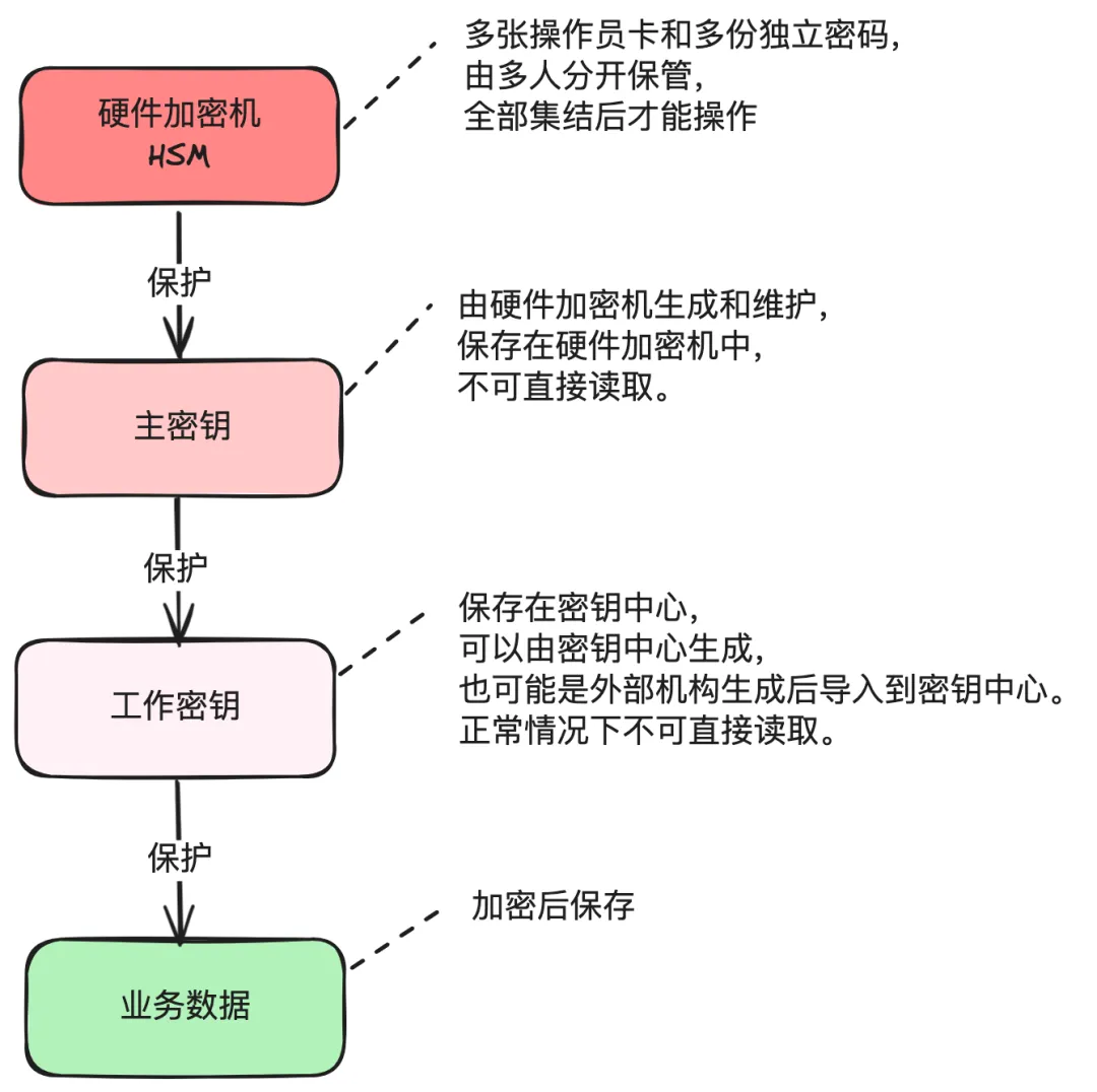 - 采用硬件加密机HSM来制作和存储主密钥。
