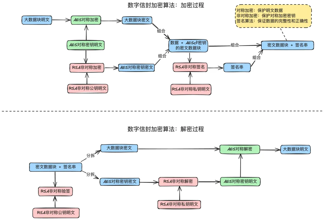 数字信封加密算法融合了对称加密、非对称加密、数字签名和验签等多种类型的加密技术,在网络安全领域被广泛应用于保障信息传输的安全性与完整性。传递的数据如同被封装在信封中,在接收端解密后还原为原始明文内容。因此这一过程被形象地称为数字信封加密。