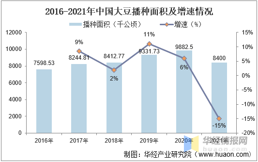 2016-2021年中国大豆播种面积及增速情况