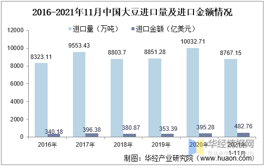 2016-2021年11月中国大豆进口量及进口金额情况