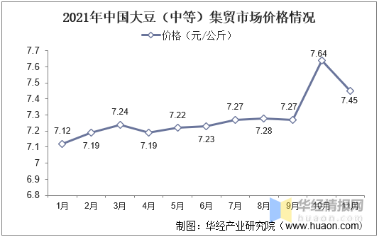 从我国大豆价格情况来看,2021年11月大豆(中等)集贸市场价格为7.45元/公斤,相比2020年11月增长了0.57元/公斤,同比增长8.3%;相比上月增长了0.11元/公斤,环比增长1.5%。