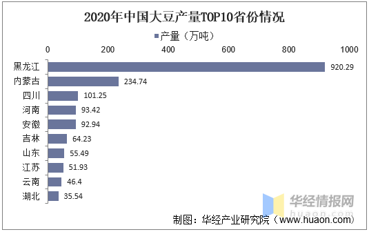 从大豆各省份产量情况来看,2020年我国大豆产量前三的省份为黑龙江、内蒙古和四川,产量分别为920.29万吨、234.74万吨和101.25万吨。