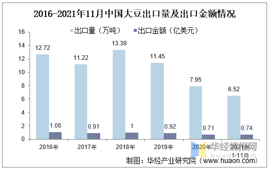 2016-2021年11月中国大豆出口量及出口金额情况