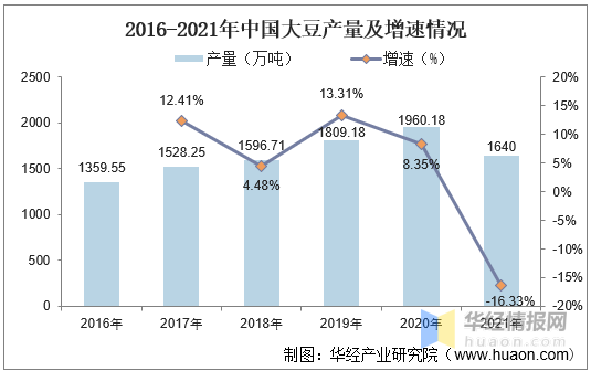 得益于我国大豆播种面积的不断增加,我国大豆产量也随之不断提升,2021年由于我国大豆播种面积的减少,大豆产量也随之下降。据资料显示,2021年我国大豆产量为1640万吨,同比2020年减少16.33%。