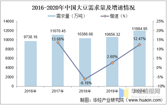 随着我国居民对豆制品及食用植物油消费需求的提高,大豆需求节节攀升。据资料显示,2020年中国大豆需求量达11984.95万吨,较2019年增加了1328.62万吨,同比增长12.47%。