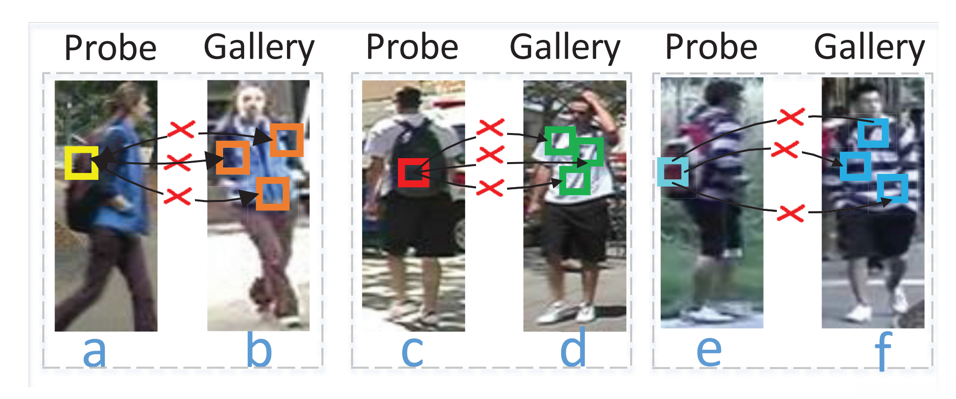 对于行人重识别任务,一个最主要的挑战就是由于拍摄视角和行人动作多样的变化造成的图片对之间空间上对不准的问题。大部分现在的方法主要关注的是通过比较图片之间整体的差异解决行人重识别问题,但这些方法忽略了空间上对不准的问题。为解决这个问题,许多工作采用基于局部的方法,这些工作将任务划分成局部的小块,然后进行patch级别的匹配。这些方法在一定程度上解决了空间上对不准的问题,但是由于缺乏空间和视觉语义的上下文信息,在视觉上相似的身体外观或者有遮挡的情况下,这些方法仍然会失败。