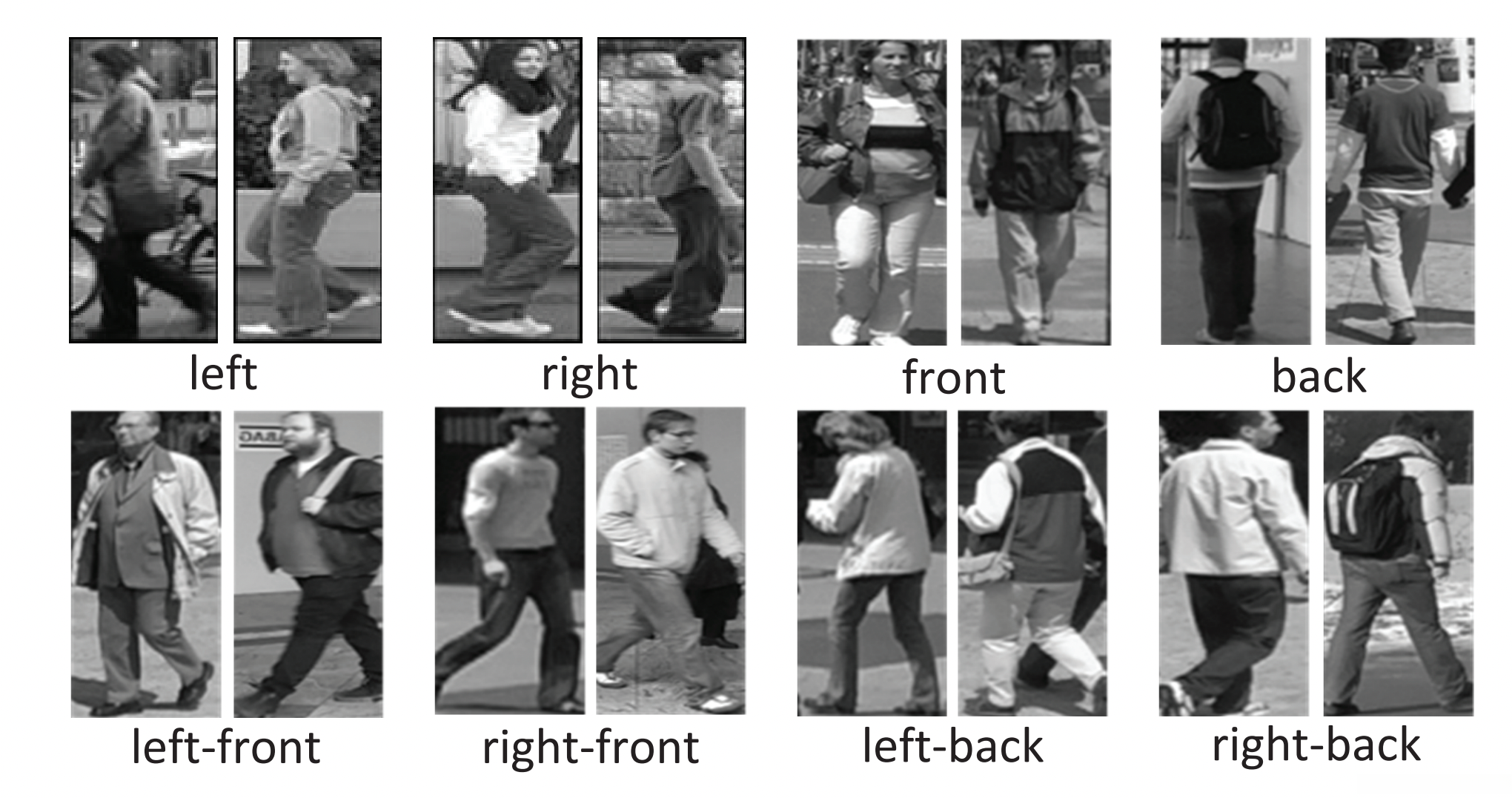 提出了采用简单有效的随机森林方法,比较不同身体朝向。根据身体朝向,行人图片可以分为8种,分别是:左,右,前,后,左前,右前,左后,右后。如下图所示。
