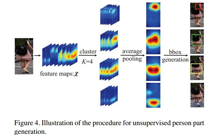 其中 z为通道数,然后用L_{2}距离将这些坐标点 (h,w)聚成K类。然后在每个聚类中用average pooling(聚类中的通道上)并min-max归一化得到显著性图像。然后用阈值0.5将显著性图像变为二值图像,并将二值图的最大外接矩形作为人体部件的bounding box。