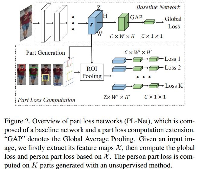 目前大多数表征学习方法的目的是最小化训练集的分类损失,这与Re-ID任务不同。表征学习方法更多的关注于人体的躯干部分,而忽略其他部分。对于不同的人,其他部分诸如头部,上半身体依然是意义的。基于此,作者提出了PL-net(part loss networks),它自动将一副图像分成K个parts,然后分别计算每个parts的分类损失。