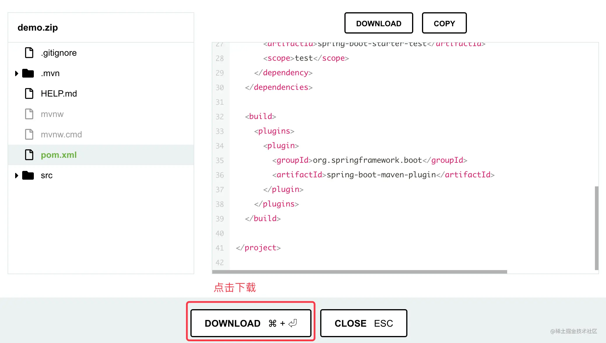 打开新生成的springboot项目,可以看到pom.xml里面只有少数几个依赖: