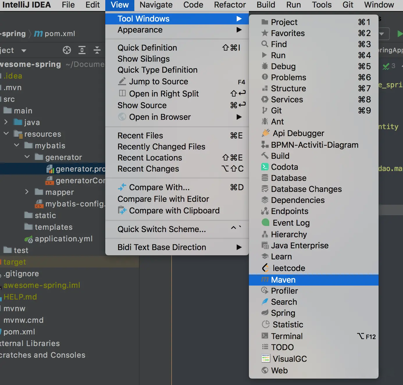 完成之后,我们可能会认识到项目中已自动生成了对应的数据表实体类,映射接口以及Mapper.xml等文件
