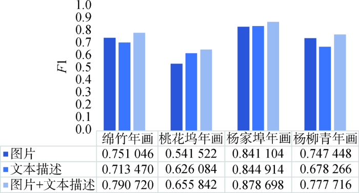 本文重点阐述了多模态融合在非遗图片分类中的应用价值,在具体分析中分别采用图像特征、文本信息以及图像与文本的交互机制对各类非遗年画进行分类测试(图4)。