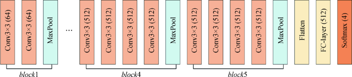 该模型旨在实现微调任务,并基于VGG19网络进行构建。具体而言,在ImageNet数据集上预先训练好的VGG19网络作为基础架构,在此之上去除了原有的全连接层结构,并新增了一层全连接层以及一层用于分类识别的Softmax层(如图3所示)。该模型由五个独立的功能模块构成(如图3所示),其中每个模块包含不同数量的卷积神经网络(CNN)层数目以及特定尺寸与数量的不同滤波器;其中"Conv"代表卷积神经网络(CNN)层;"3 ××3"表示滤波器尺寸;括号内的数值512表示对应滤波器的数量;"Flatten"操作负责将输出数据展平;而"FC-layer"(简称fc)则代表全连接层,在此过程中括号内的数值反映了其输出维度。
