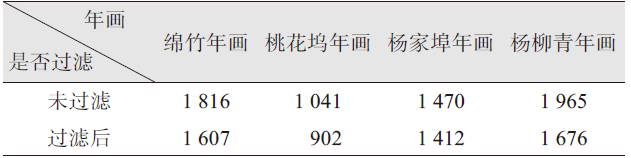 对获取到的这批年画数据实施预处理,在筛选过程中将所有与内容无关以及相关描述不符的内容剔除;在筛选过程中若某一类样本中存在不属于该类的内容也会被剔除。随后并对这些样本中的文字表述进行去停用词处理;经过上述处理后可观察至原始样本和最终分类结果的数量统计情况如 表 1 所示;其中数字即代表各类别图像的数量也代表对应的文字描述。