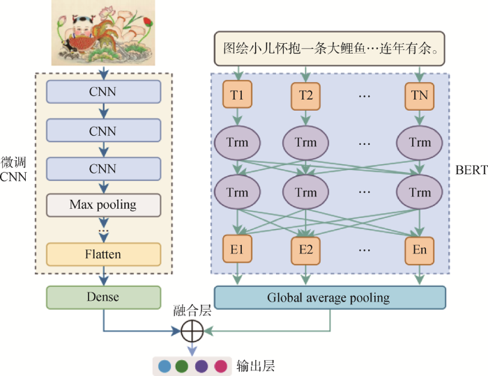 利用多种数据类型的多模态融合技术构建的非遗图片分类模型具体如图2所示,主要由经过微调优化的卷积神经网络(CNN)、BERT、融合模块和分类器组成。